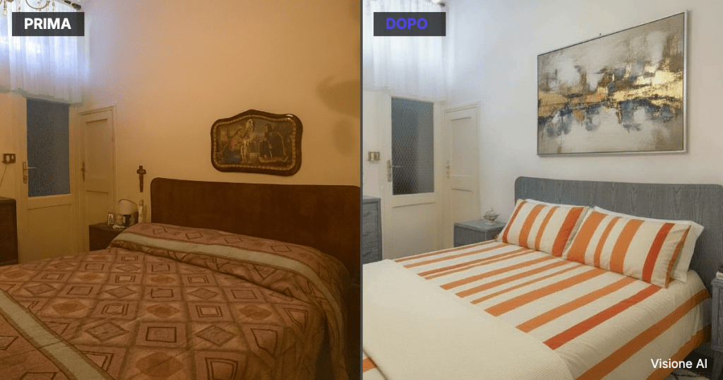 Ricordo perfettamente il momento in cui ho aperto l’immagine originale di questa camera da letto. La prima cosa che mi ha colpito è stata l’atmosfera pesante, quasi soffocante. L’occhio esperto di Visione AI ha immediatamente confermato le mie impressioni: